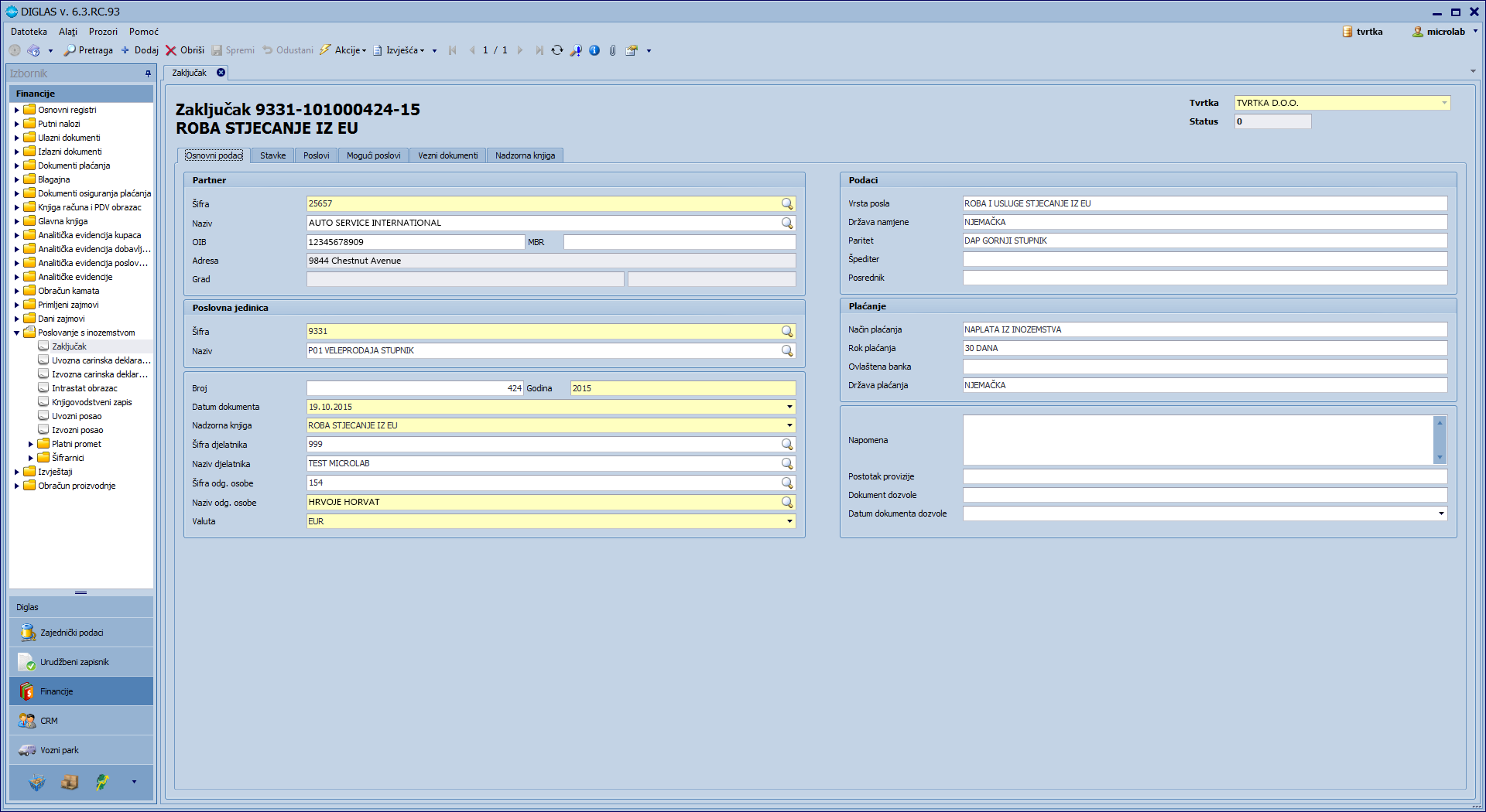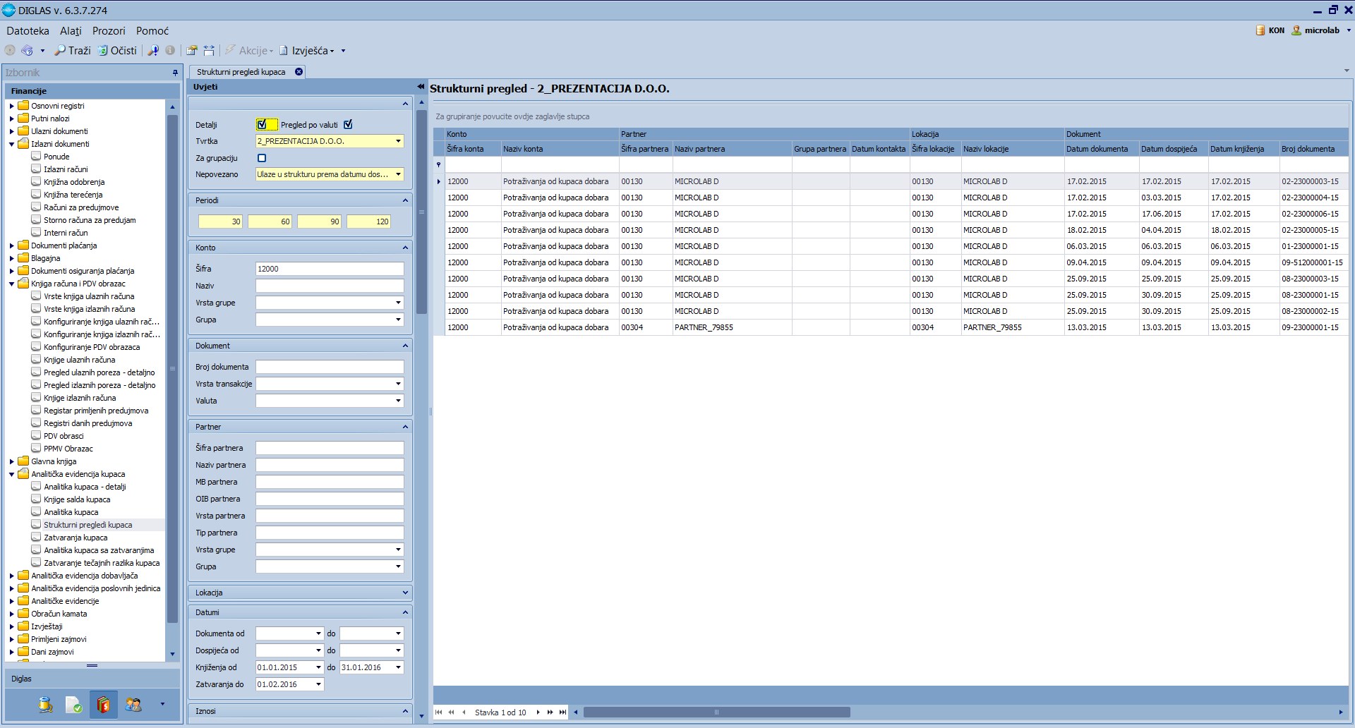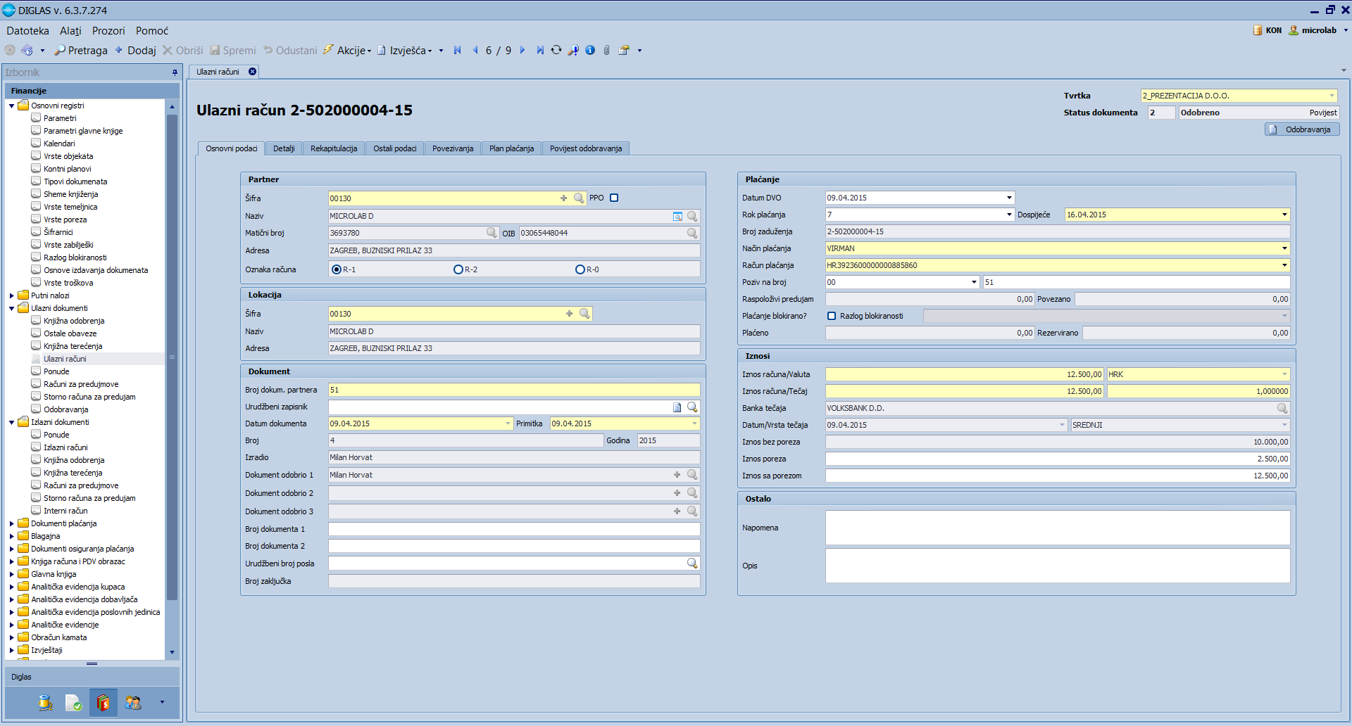 Diglas Accounting enables the manual and automatic recording of financial information according to account recording schemes, detailed (analytical) and (cumulative) displays and printing of entries in reports prescribed by law. Recordings can be mate in regard to 20 different accounting items (5 obligatory and 16 non-obligatory) which are included as needed. Complete monitoring of tax records in possible with a flexible approach to compliance with legal changes as well as the keeping of tax records, tax computation and control according to the general ledger.