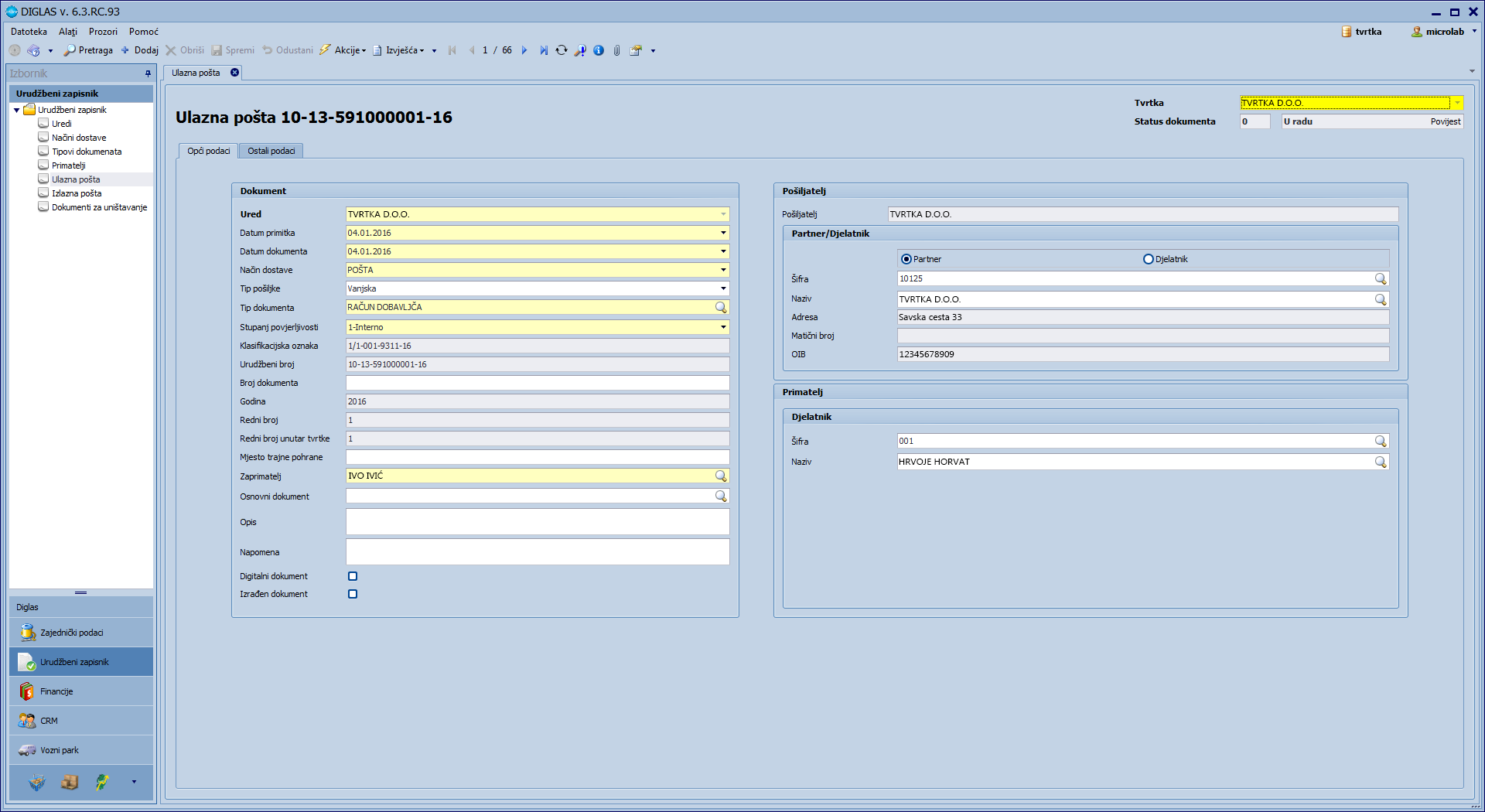Diglas Central Records enables the registration of incoming mail, storing of scanned original documents and access to them from other Diglas modules when needed.