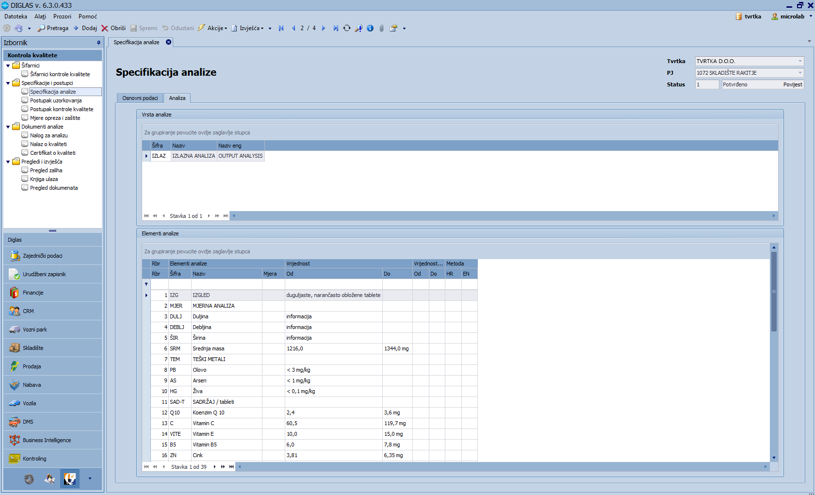 Diglas Kontrola kvalitete omogućava sustavno upravljanje aktivnostima kontrole kvalitete proizvoda.